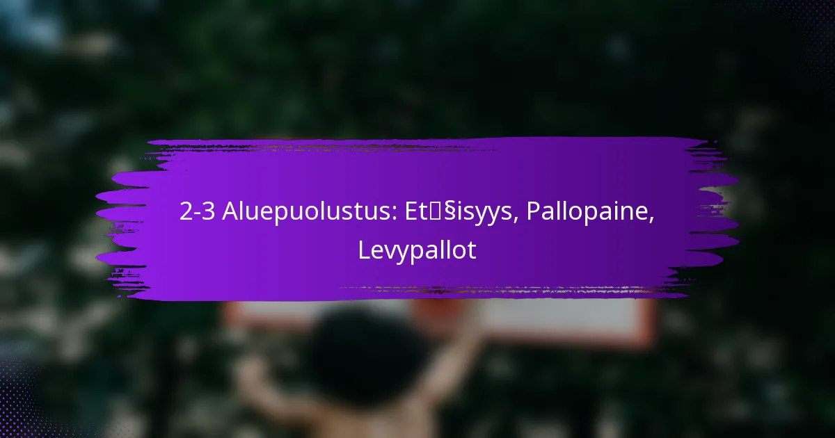 2-3 aluepuolustus on koripallostrategia, joka on suunniteltu suojaamaan maalia kolmella pelaajalla samalla, kun kaksi puolustaa reunoja, rajoittaen tehokkaasti sisäisiä pisteytysmahdollisuuksia. Keskeiset elementit, kuten välimatka, pallopaine ja levypallot, ovat olennaisia puolustuksen eheyden ylläpitämiseksi ja vastustajan hyökkäyksen häiritsemiseksi. Varmistamalla oikean välimatkan puolustajat voivat kattaa omat alueensa samalla tukien joukkuetovereitaan, kun taas aggressiivinen pallopaine voi pakottaa vastustajat virheisiin ja rajoittaa hyökkäysvaihtoehtoja.