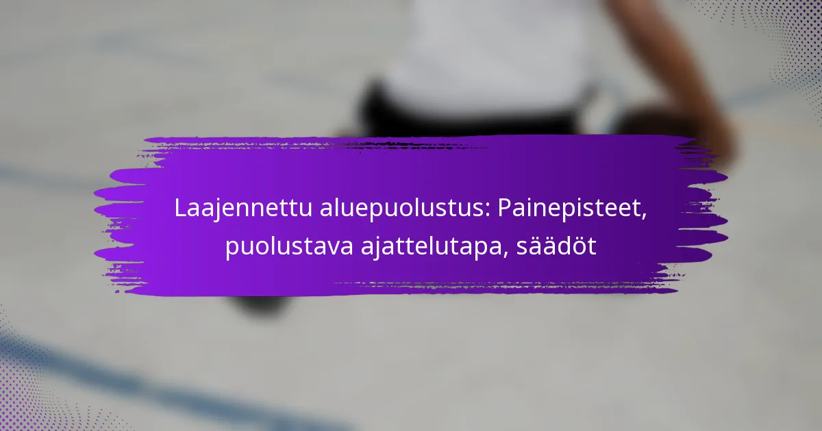 Laajennettu aluepuolustus on strateginen koripallotaktiikka, joka korostaa painetta pallonkäsittelijään samalla kun se kattaa suuremman alueen kentästä. Kohdistamalla tiettyihin painepisteisiin tämä taktiikka häiritsee hyökkäyksen rytmiä, pakottaen pallonmenetyksiin ja luoden haastavia heittomahdollisuuksia vastustajille. Menestyksekäs toteutus vaatii puolustavaa ajattelutapaa, joka keskittyy yhteiseen vastuuseen, ennakoimiseen ja sopeutumiseen, varmistaen, että pelaajat pysyvät tietoisina ja reagoivina pelin dynamiikkaan.